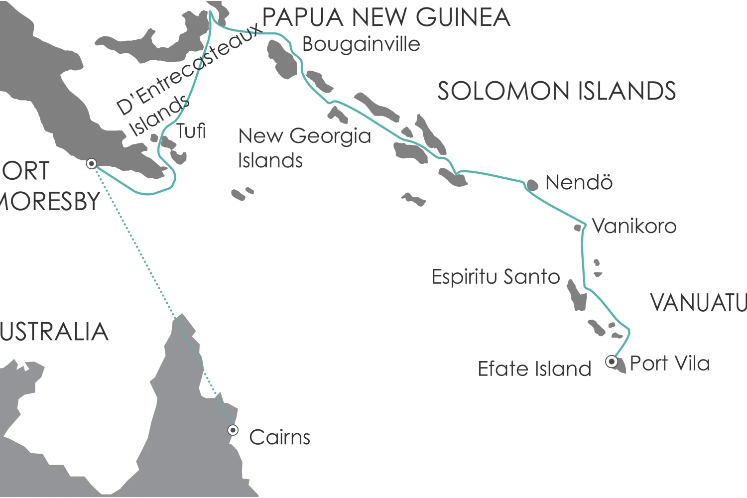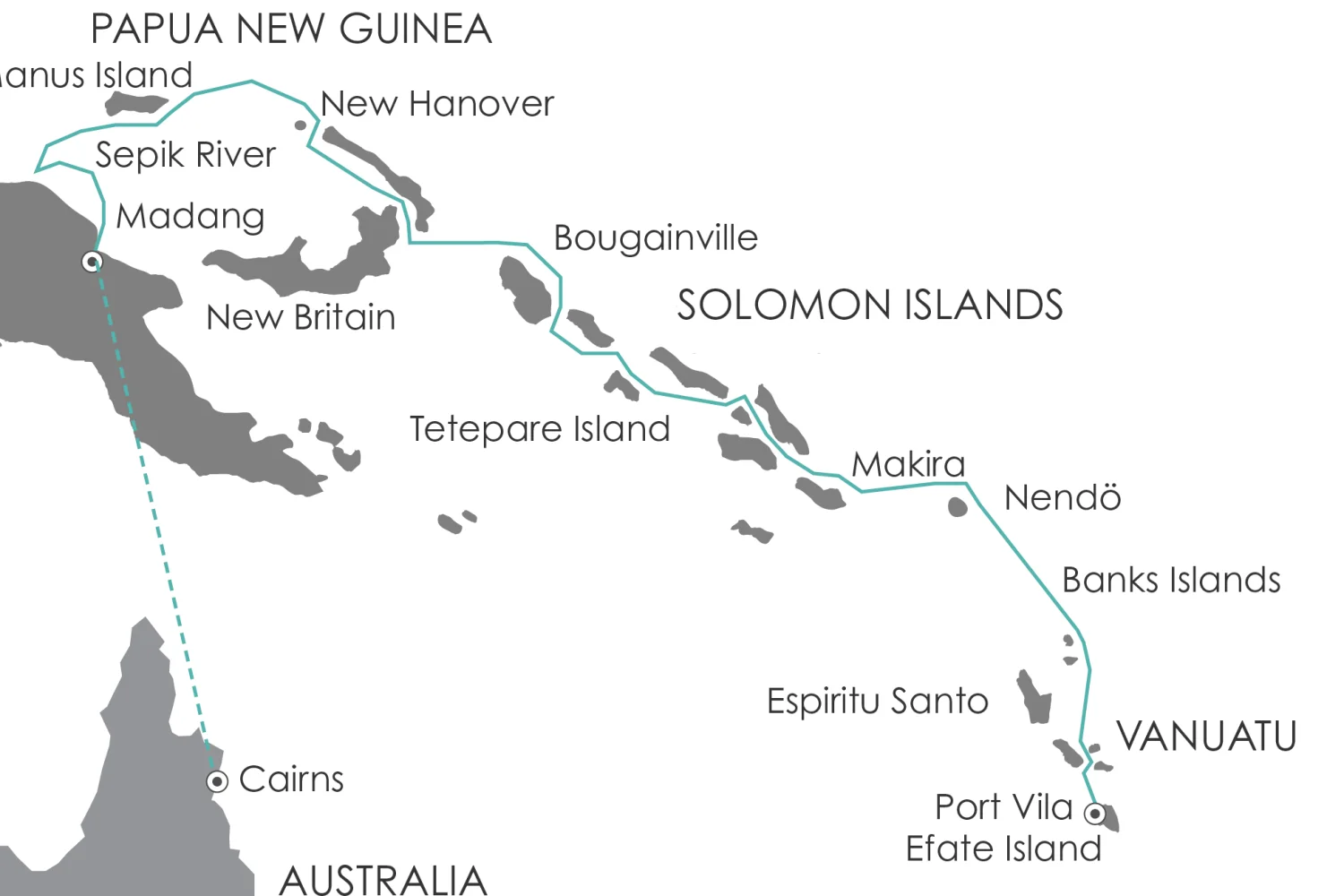 Diese vielseitige Expeditionsreise führt von Cairns durch Papua‑Neuguinea, die Salomonen und bis nach Vanuatu. Nach einem ersten Abend in Cairns beginnt das Abenteuer mit dem Flug nach Madang, wo traditionelle Kunst, Märkte und historische Sehenswürdigkeiten erste Einblicke in die kulturelle Vielfalt des Landes geben.
